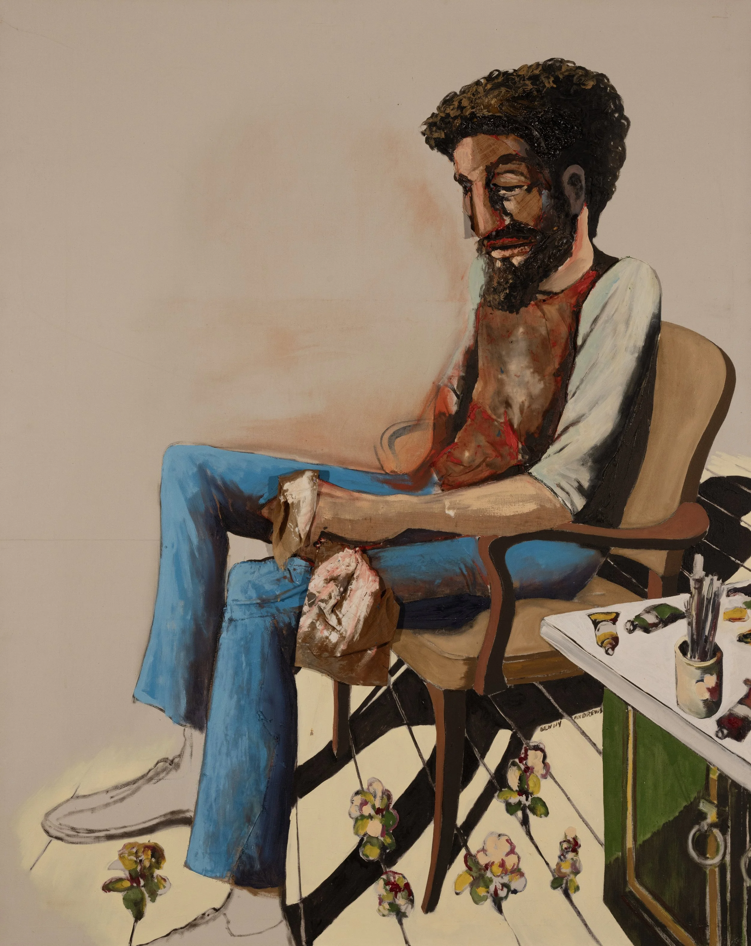 EDGE OF REALITY Andrews uses this self portrait to describe his personal feelings of exhaustion from his community efforts from teaching to being a community leader (co founder of BECC) to being an activist fighting against institutional discrimination within mainstream museums. The self portrait offers viewers a look at the private life of a true crusader, where he sits quietly in stillness, resting from his societal battles.